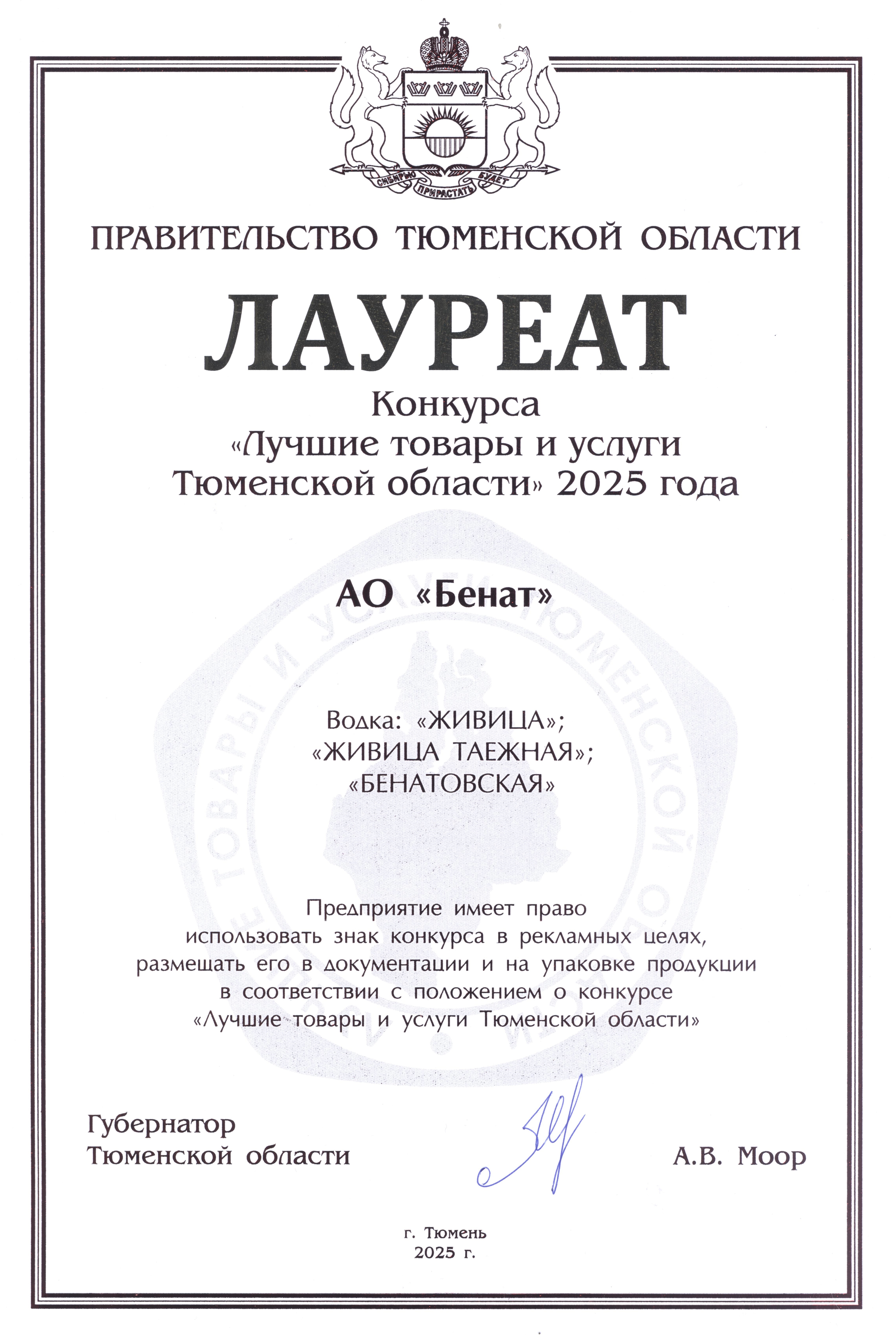 Завод "Бенат" является крупнейшим производителем водочной продукции в УрФО; основан и работает в Тюмени — городе, который в России называют Воротами Сибири. Сегодня тюменские торговые марки завода продаются по всей России и поставляются на экспорт. Мы сотрудничаем с федеральными и региональными торговыми сетями и активно развиваем собственные бренды, чтобы как можно больше покупателей смогли попробовать и оценить высококачественную продукцию АО "Бенат".